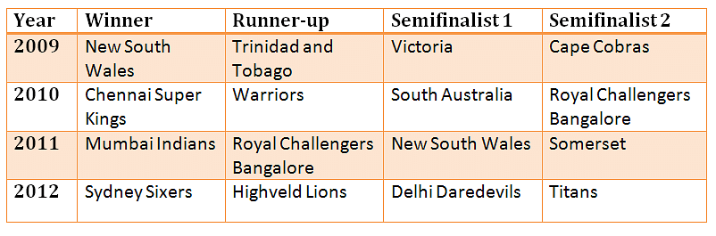 Here is a list of the teams which finished in top four in all the four concluded editions of the Champions League T20. South African teams have finished as runner-up twice. Can they better their effort this time around?