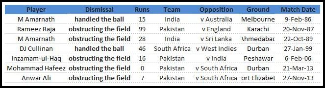 Mohinder Amarnath of India was the victim of the first incident of handling the ball in ODIs, where he was adjudged out. Darren Cullinan went through a similar fate in 1999 against West Indies.