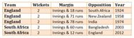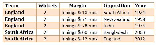 Here is a list of five incidences in Test cricket where a team managed to win a Test after losing just two wickets in the entire match. It has only happened five times in the history of Test cricket. The latest being the 1st Test between England and South Africa at Kennington Oval, London.
