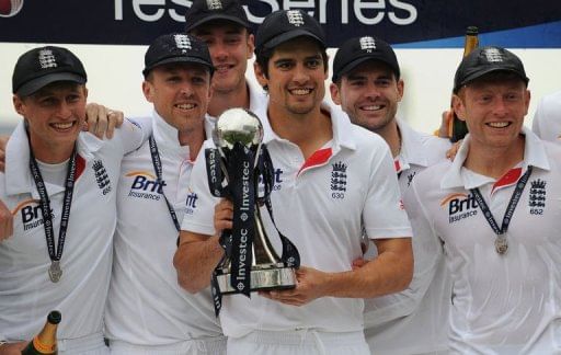 England’s Alastair Cook (C) holds the trophy with teammates as England celebrates a series win on the fifth day in the second international cricket Test match between England and New Zealand at Headingly in Leeds on May 28, 2013. Graeme Swann bowled England to a commanding 247-run in the second Test against New Zealand in Leeds on Tuesday with rain unable to save the tourists.