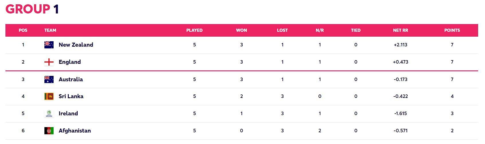Sri Lanka suffered their third loss in the Super 12 stage and finished with only four points to their name. They finish the competition in the fourth position. Ireland finished at the fifth position, having managed to win only a single game out of five. Afghanistan are the wooden spoon holder of Group 1 as they failed to win a single game and finish with two points to their name.