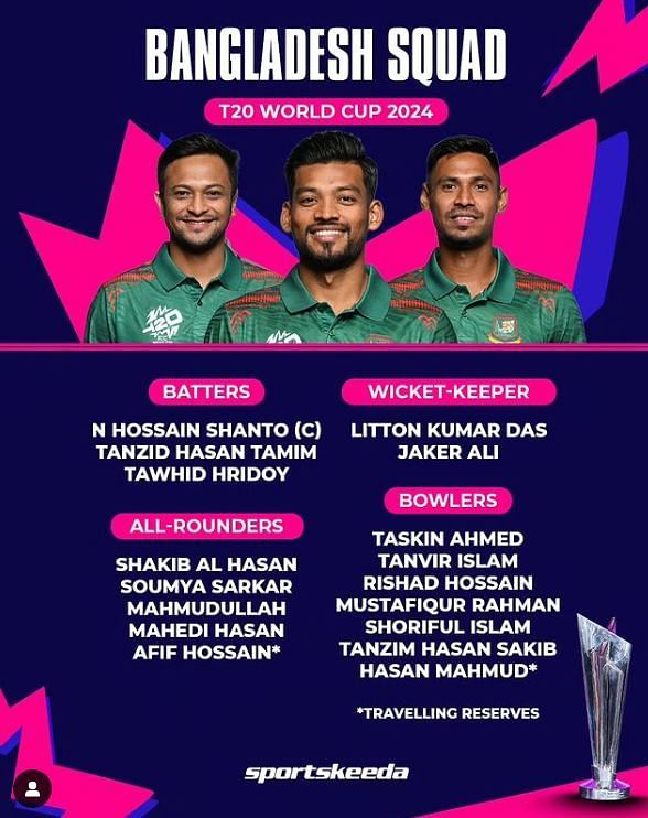 The Bangladesh squad for T20 World cup 2024 has a 15 member team which includes: Najmul Hossain Shanto (c), Taskin Ahmed, Litton Das, Soumya Sarkar, Tanzid Hasan Tamim, Shakib Al Hasan, Tawhid Hridoy, Mahmud Ullah Riyad, Jaker Ali Anik, Tanvir Islam, Shak Mahedi Hasan, Rishad Hossain, Mustafizur Rahman, Shoriful Islam, Tanzim Hasan Sakib. Travelling reserves: Afif Hossain, Hasan Mahmud.