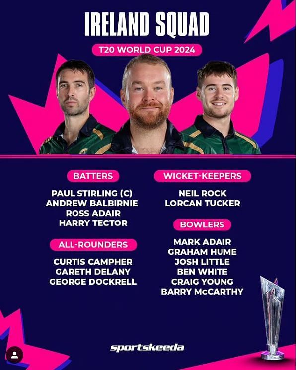 The Ireland squad for T20 World cup 2024 has a 15 member team which includes: Paul Stirling (c), Mark Adair, Ross Adair, Andrew Balbirnie, Curtis Campher, Gareth Delany, George Dockrell, Graham Hume, Josh Little, Barry McCarthy, Neil Rock, Harry Tector, Lorcan Tucker, Ben White, Craig Young.