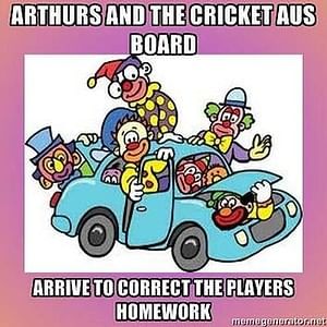 “Mickey Arthur: ‘This is a line in the sand.’ It’s called a crease. Behind it are are three poles: they’re called stumps … #laughingstock” – Greg Baum