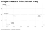 Predictably, Andre Russell is way ahead of the rest in this metric. Russel has an excellent strike rate in the IPL, with nobody even comeing close, but has a sub-par average.