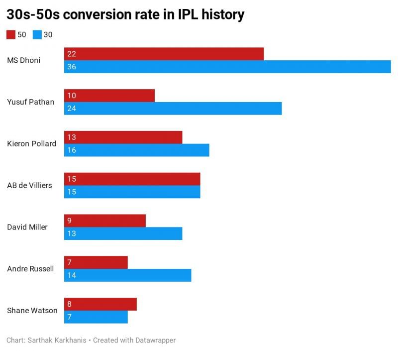 MS Dhoni has a below-par conversion rate of 0.61 in IPL but with 58 30+ scores over the years in the middle order, he is bound to have more 30s than 50s. Also, most of the 3-time IPL winning captain's innings have come during the death overs, which explains that 19 of his 36 30+ scores are unbeaten ones.