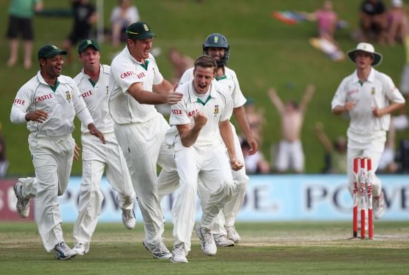 CENTURION, SOUTH AFRICA – DECEMBER 19: Morne Morkel of South Africa celebrates with Graeme Smith and his team-mates after taking the wicket of Andrew Strauss of England for 1 run during day four of the first test match between South Africa and England at Centurion Park on December 19, 2009 in Centurion, South Africa. (Photo by Paul Gilham/Getty Images)
