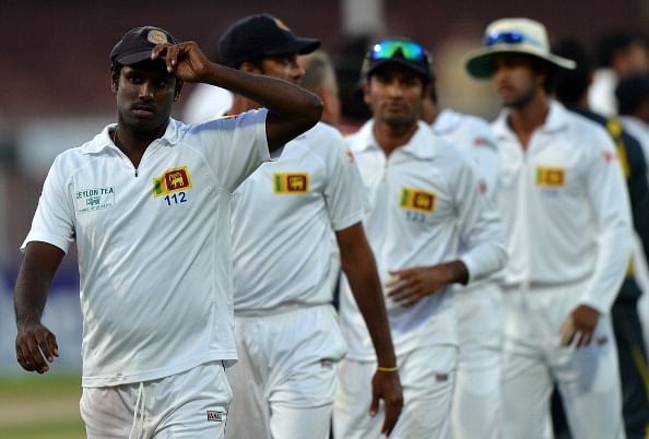 Sri Lanka’s cricket team captain Angelo Mathews leaves the field with his teammates after losing to Pakistan in the final day of their third and final cricket Test match at the Sharjah International Cricket Stadium, in the Gulf emirate of Shrajah on January 20, 2014.