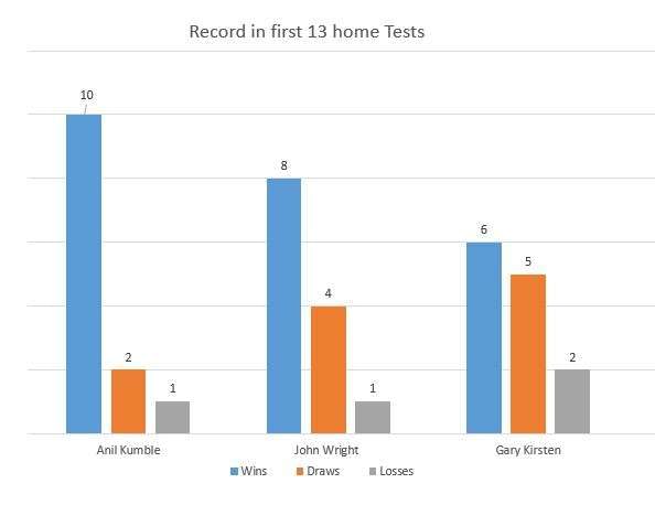 These are numbers any coach in any part of the world would grab at the drop of a hat. Kumble was a part of the Indian dressing room for 15 Test matches, and the team won 12 of them. The only real hiccup that they faced within this period was when they lost a single Test to Australia in Pune. The team had remained unbeaten in eight consecutive home Tests before that.