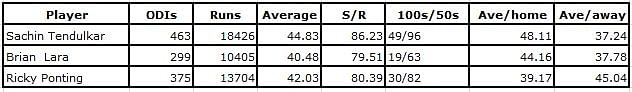 But Tendulkar used to open the innings for a majority of those matches and used to go after the new ball almost from the get-go, thereby increasing his chances of getting out. Yet his numbers in ODIs are higher than the other two, and that in my book, helps him top the list.
