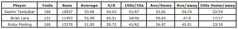In Tests, the scenario is a little different. While Tendulkar has scored more runs than his rivals, he has played 67 more Tests than Lara and 30 more than Ponting.