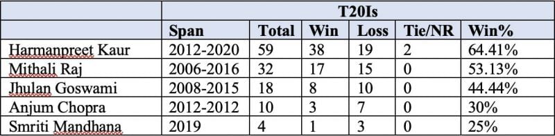 Overall, Kaur has led India in 59 T20Is, winning 38, at an impressive winning percentage of 66.66%. That makes her the third most successful captain in the T20 format, among those who have led in more than 50 matches.