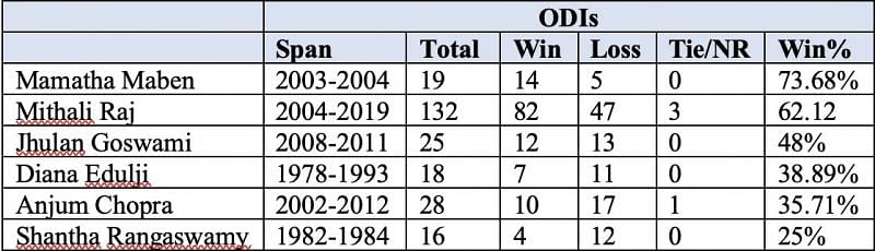 Her record in ODIs as a captain is slightly better, with four wins. Remarkably, she led the team in 16 out of the 19 ODIs that she played.