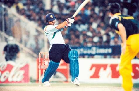 There was plenty of stuff to worry about too. Sachin had been in lone-ranger mode up until now: Ganguly’s dismissal in the ninth over had provided Sachin with a disciplined partner in Nayan Mongia, and they had the scoreboard ticking, but after Mongia went up in flames, skipper Mohammad Azharuddin and in-form Ajay Jadeja had departed in quick succession. Four down with just over an hundred on board was never good news. And now with the revised target, they needed divine providence to win this.