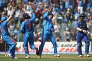 MUMBAI, INDIA – APRIL 02: Harbhajan Singh (C) of India celebrates with his captain MS Dhoni (2L) after bowling Tillakaratne Dilshan as Kumar Sangakkara (R) of Sri Lanka looks on during the 2011 ICC World Cup Final between India and Sri Lanka at Wankhede Stadium on April 2, 2011 in Mumbai, India.
