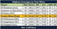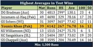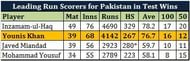 In terms of averages among all batsmen that have scored at least 1,500 runs in test match wins for their countries, Younis Khan is right up there; behind only Sir Don Bradman, Inzamam, and Sir Gary Sobers.