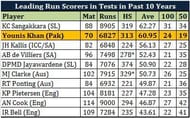 Younis is among the 10 highest run scorers in test cricket in the past 10 years. It is no surprise that he has played the least amount of tests among these 10 batsmen; significantly less at that. Among these 10 batsmen, Younis is one of the only two who average over 60; Sangakkara is the other one.