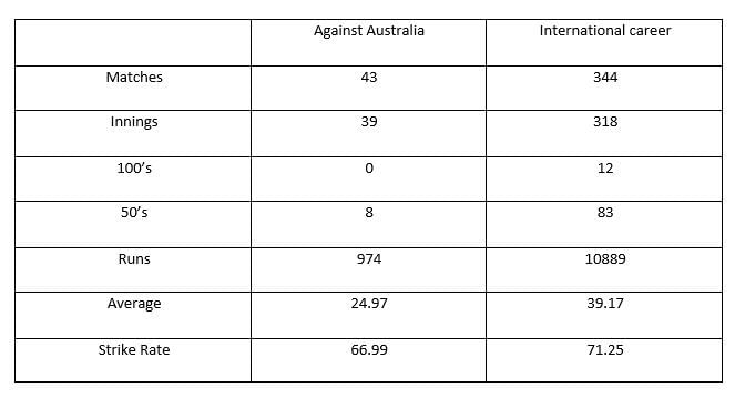 These three legends failed to make an impact against the mighty Australians as their average and strike-rate took a huge dip when they played against them.