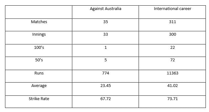 But sadly, out of his 33 innings against Australia, he had 18 scores in single digits. He was often dismissed to deliveries outside the off stump, which on any other day, against any other opposition, he would have caressed it through covers.
