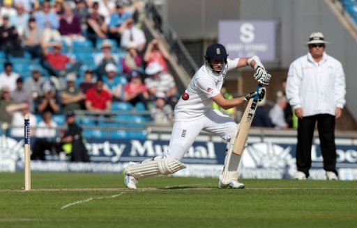 England batsman Joe Root plays a shot during the second cricket Test match between England and New Zealand at the Headingley stadium in Leeds on May 25, 2013. England were 337 for seven at stumps on the second day after Root made 104.