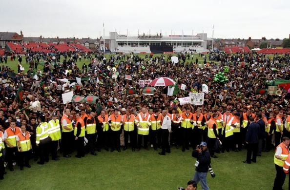 The Bangladesh fans gather on the pitch after Bangladesh win the Cricket World Cup Group B match against Pakistan played in Northampton, England. Bangladesh won the game by 62 runs.