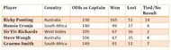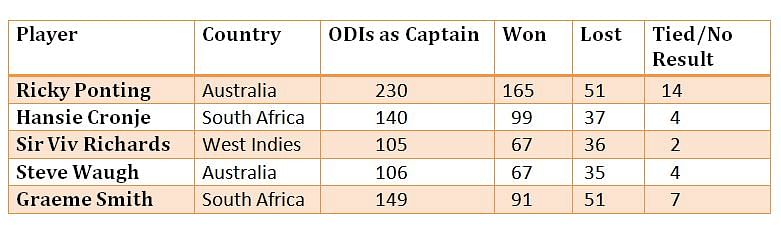 Here is a list of the top five captains in the history of ODI cricket based on their winning percentage. Only players who have captained their team in more than 100 ODIs are taken into consideration. Given their domination in this format over the last couple of decades, its only fair that the list has two entries each from Australia and South Africa. Ricky Ponting leads the list with a staggering percentile of 71.74 with 165 wins from 230 matches as captain.