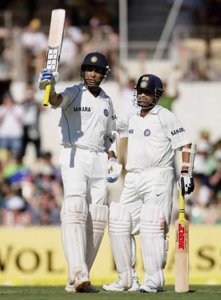 ADELAIDE, AUSTRALIA – JANUARY 24: VVS Laxman of India celebrates scoring a half century with teammate Sachin Tendulkar during day one of the Fourth Test between Australia and India at Adelaide Oval January 24, 2008 in Adelaide, Australia. (Photo by Robert Cianflone/Getty Images)