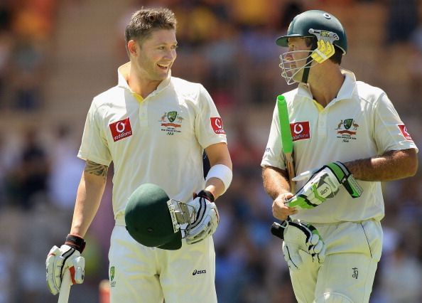 William Lawry and Bob Simpson were the batsmen when Australia managed it for the third time, in 1965 against West Indies at Barbados. Ricky Ponting and Michael Clarke were the last pair to do it when they both scored double centuries against India at Adelaide in 2012 as Australia hammered India by 298 runs.