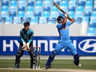 Deepak Hooda of India bats as Alex Baum looks on during the ICC U19 Cricket World Cup 2014 match between India and Scotland at the Dubai Sports City Cricket Stadium on February 17, 2014 in Dubai, United Arab Emirates.