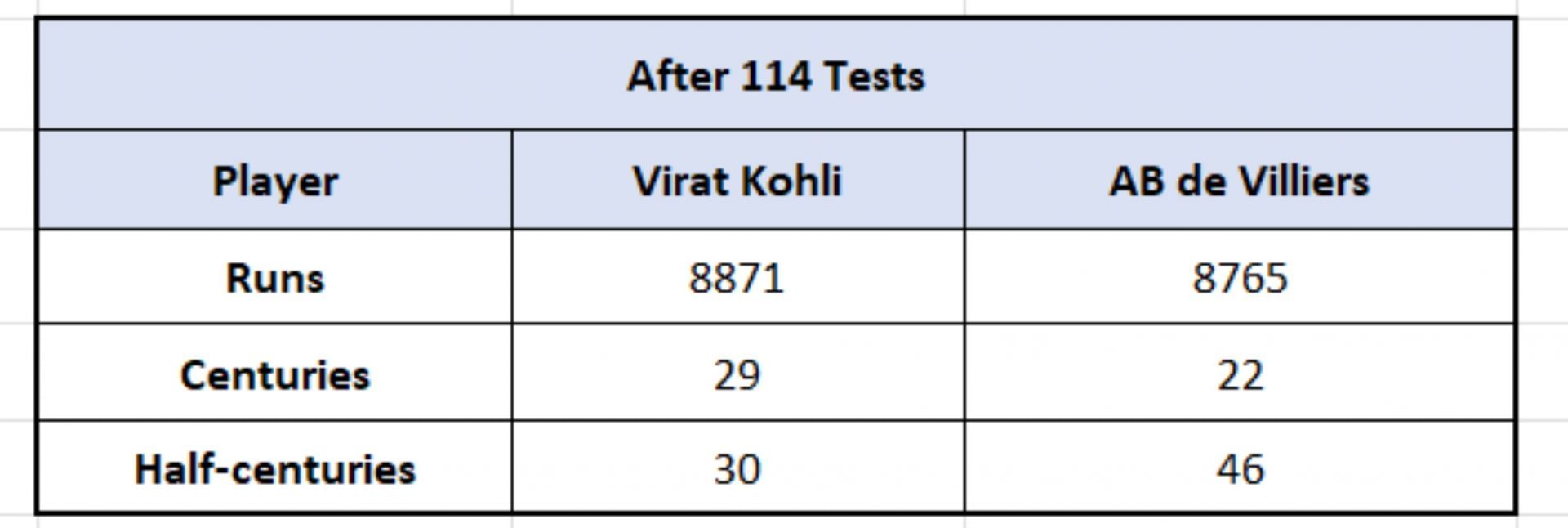 On that note, to maintain a common denominator, let us deep dive into Virat Kohli and AB de Villiers' Test numbers after 114 matches and see who comes out on top.
