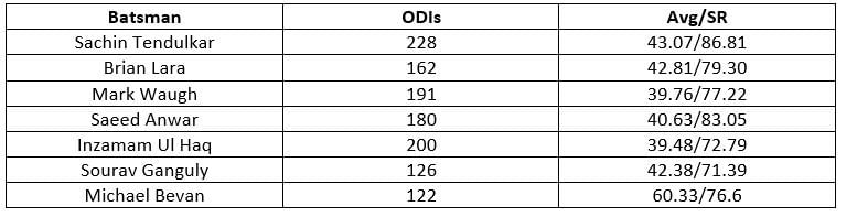 In this case Brian Lara, Mark Waugh, Saeed Anwar, Sourav Ganguly, Michael Bevan and Inzamam Ul Haq have been considered. The mean average of their numbers comes out to be 44.21, which is marginally higher than Tendulkar's average, and the mean strike rate is 76.72.