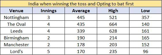 There have of course been exceptions to this, none more famous than the Leeds Test of 2002, where India opted to bat first on a green track under overcast conditions and brilliant centuries from Dravid, Ganguly, and Tendulkar led them to a famous win. But these have been rare. The Oval and Trent Bridge are the only two venues where the Indian team has done well repeatedly after choosing to bat first.