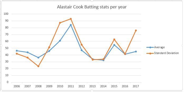 Should this be a worrying sign for Cook and the England selectors? Is this aberration a one-off or the beginning of a new trend? The underlying scores between the last two data points are 3, 69, 3, 42, 88, 7, 46, 10, 243, 11, 23, 10, 17, 2, 7, 37, 16, 7, 14, 283, 10. The scores for the year 2017 also take into account the last Test match of the Ashes series played in January 2018. The standard deviation is a result of a data set that is scattered and you have two humungous scores interspersed with a number of failures and a few marginal performances.