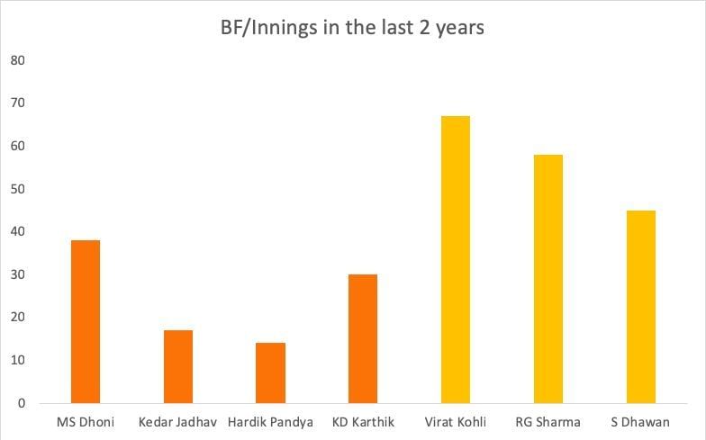 Let us take a look at statistics that give an insight into this disparity. Here are the balls faced by batsman per innings in the last two years. The numbers very clearly illustrate the fact that the top order (indicated in yellow) are facing a large number of balls in comparison to the middle-order (indicated in orange).