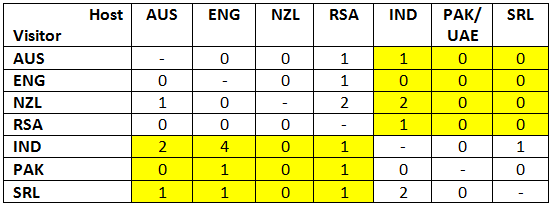If we see the performance of subcontinent teams (India, Pakistan and Sri Lanka) outside Asia and that of non-subcontinent teams (Australia, England, New Zealand and South Africa) in Asia, India’s gulf with other teams increases further. Seven of India’s eight losses by an innings have come in conditions outside Asia. Sri Lanka, who are blessed with far lesser talent, have been consigned to such heavy defeats on just 3 occasions.