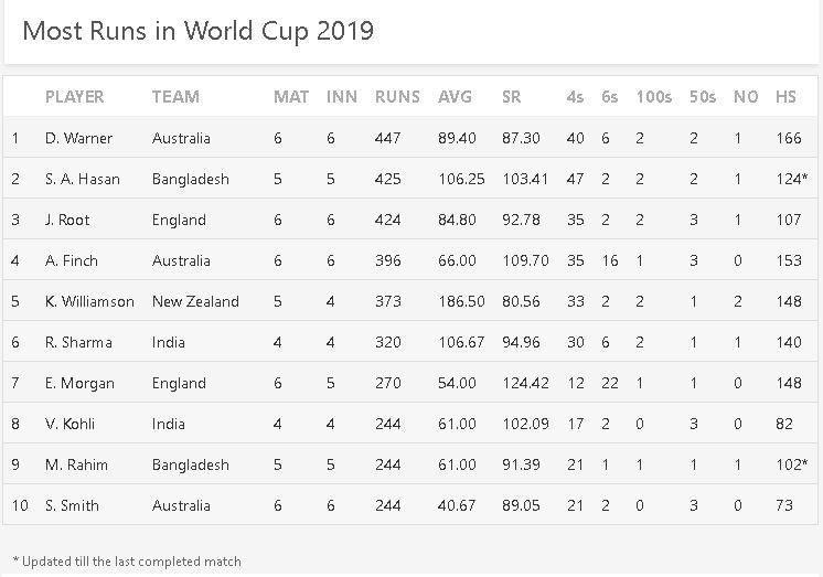 Kane Williamson's fantastic 148 off 154 balls rocketed him into the Top 10 list for most runs in the 2019 World Cup. He holds the 5th spot at the moment.