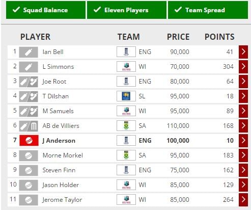 I missed out on making transfers for the England-Scotland game. It didn’t cost me as heavily as I thought it would; having Steven Finn as the default captain helped. And as there was a rain threat for the West Indies v Zimbabwe match, I changed my captaincy from Jerome Taylor to Marlon Samuels and it paid off big time as well.