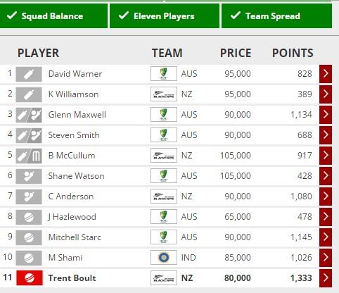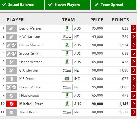 Since I already have 6 Australian players, I only have to look at the New Zealand side of things for this match. If the Kiwis bowl first, it becomes easy: bring in Daniel Vettori and Kane Williamson. It wouldn’t be easy for Brendon McCullum to slog the likes of Mitchell Starc and Mitchell Johnson late in the day, so that rules him out. Martin Guptill is not technically the best one around to last the Australian pace attack, which rules him out too.