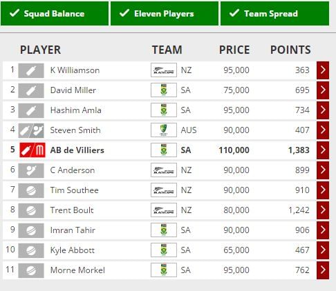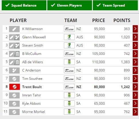 Quite a tricky match this to predict which way it would go, and therefore picking players for fantasy cricket wouldn’t be easy too. Whichever way, AB de Villiers and Trent Boult would be my first two picks for the face-off. Batting at Eden Park hasn’t been easy, especially under lights, so I have decided not to overload my team with batsmen from the side that bats second tomorrow.