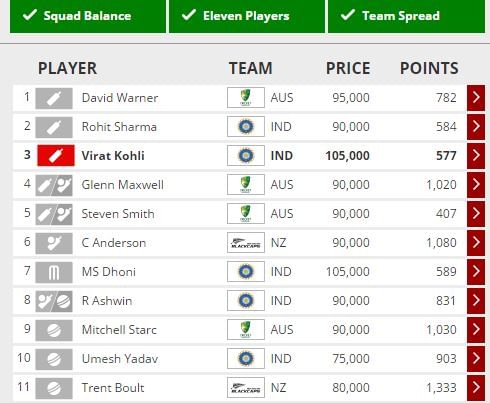 If India bat first though, in addition to Kohli and Dhoni, I would also bring in Ashwin. Instead of Shami, it will have to be Umesh Yadav – again due to budget reasons. If Yadav has one of his days, he could prove to be a handful under lights. From Australia, I will have to drop Hazlewood and Watson to accommodate the Indian players.