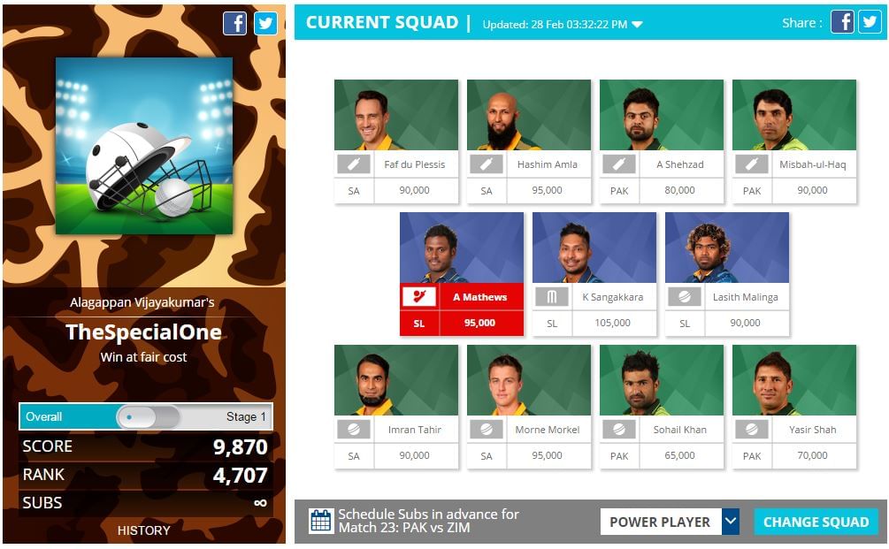 That I start Phase 2 with four Pakistan players may raise a few eyebrows. But they play thrice in a span of 7 matches, two of which against minnows Zimbabwe and United Arab Emirates, and the ploy could yield a lot of points if it works. I don’t see much scope for transfer activity in the period, either. So, those 4 will form the base of my team.