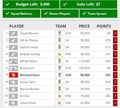 I have also stacked up my team with four South Africans: Hashim Amla, Imran Tahir, Morne Morkel and Faf du Plessis. South Africa are the second-fastest to 3 matches in the phase: in a span of 13 matches. However, it would be next to impossible to carry all these players till that point. But they play the first two in a span of 6 matches, against Ireland and Pakistan, which necessitates the inclusion of Amla, Tahir and Morkel.