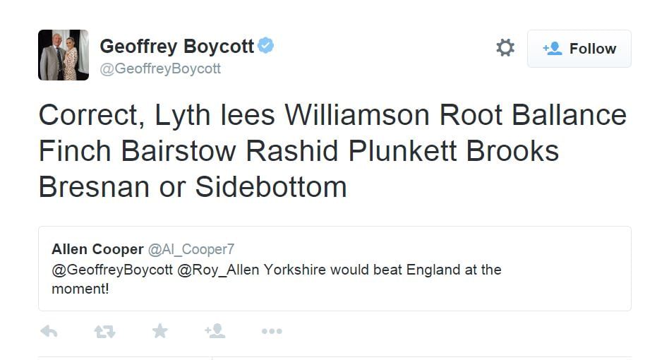 Boycott, however, doesn’t seem too optimistic about England having the ability to do so. Responding to a follower’s tweet which said that Boycott’s home county Yorkshire, who are the current county champions, would beat England at the moment, Boycott concurred and named the Yorkshire starting XI that he thinks would prove too good for England.