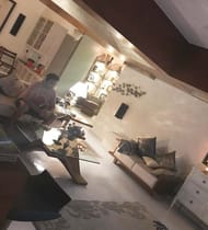 One corner that’s assured to get your attention is a pastel green nook that has an immense creamy white showcase. It holds several trophies, stone, and marble sculptures, also miniature potted plants. Moving further ahead, one can spot their warm dining space, which has a painting and a beautiful floral nook with a violet and grey backdrop. This special corner is populated with tiny and big trinkets, a soft-hued carpet, and several white drawer chests.