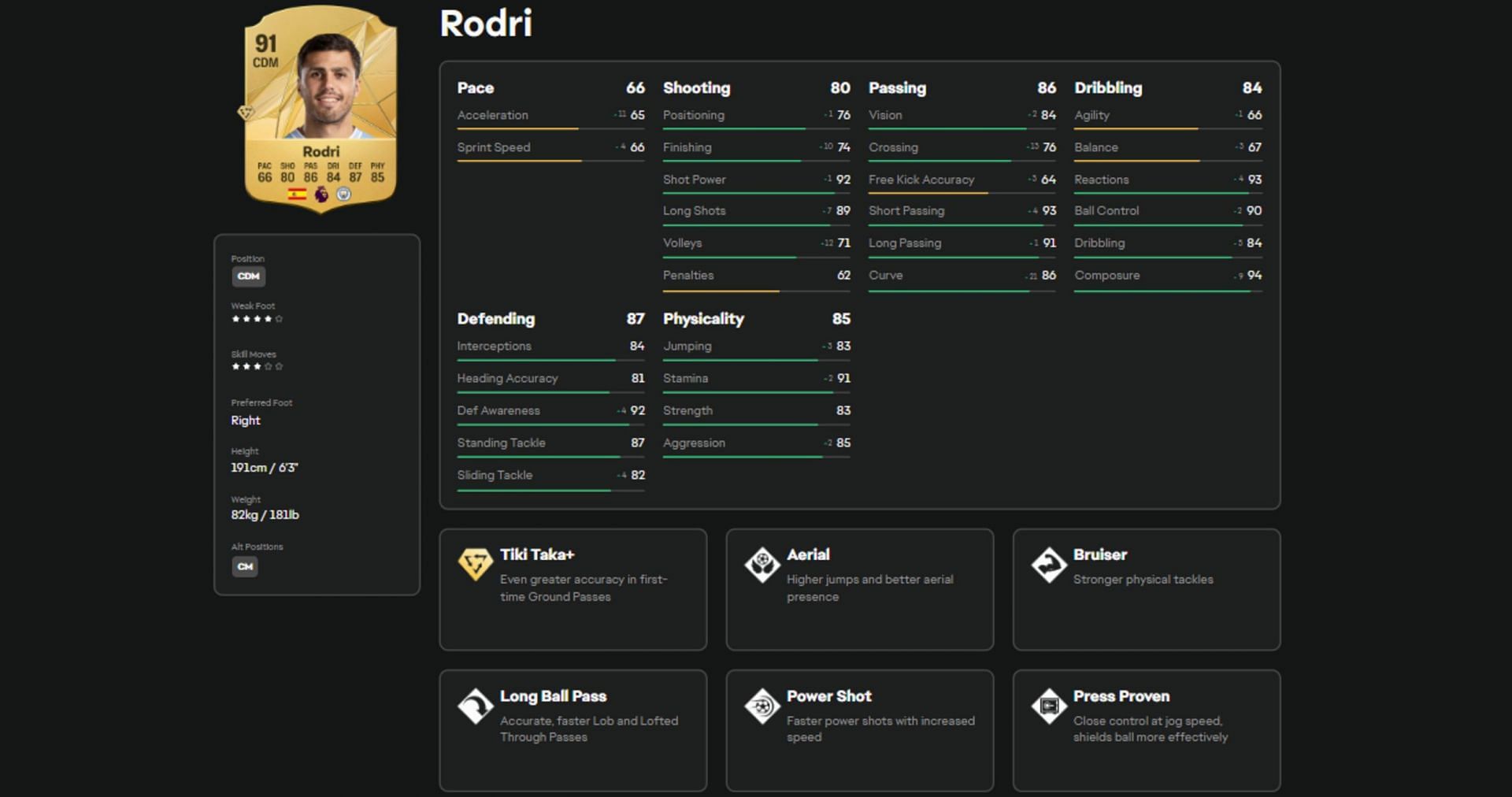 His exceptional 94 Composure ensures that he doesn’t lose his cool, making him an essential player for breaking the press. Whether you're looking to pass through the opposition or dribble into space, Rodri’s Press Proven PlayStyle helps him hold his ground against the toughest challenges in the midfield.