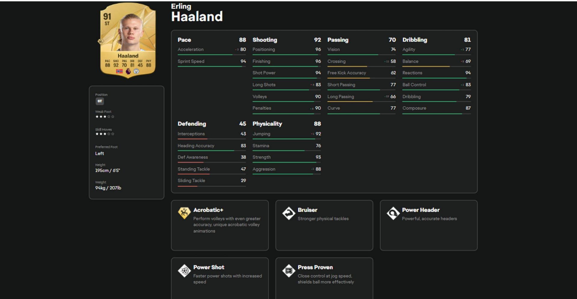 Though Haaland is often seen as a physical powerhouse, his Press Proven PlayStyle adds another layer to his in-game abilities. With 83 Ball Control, he can maintain possession even when defenders try to press him aggressively.