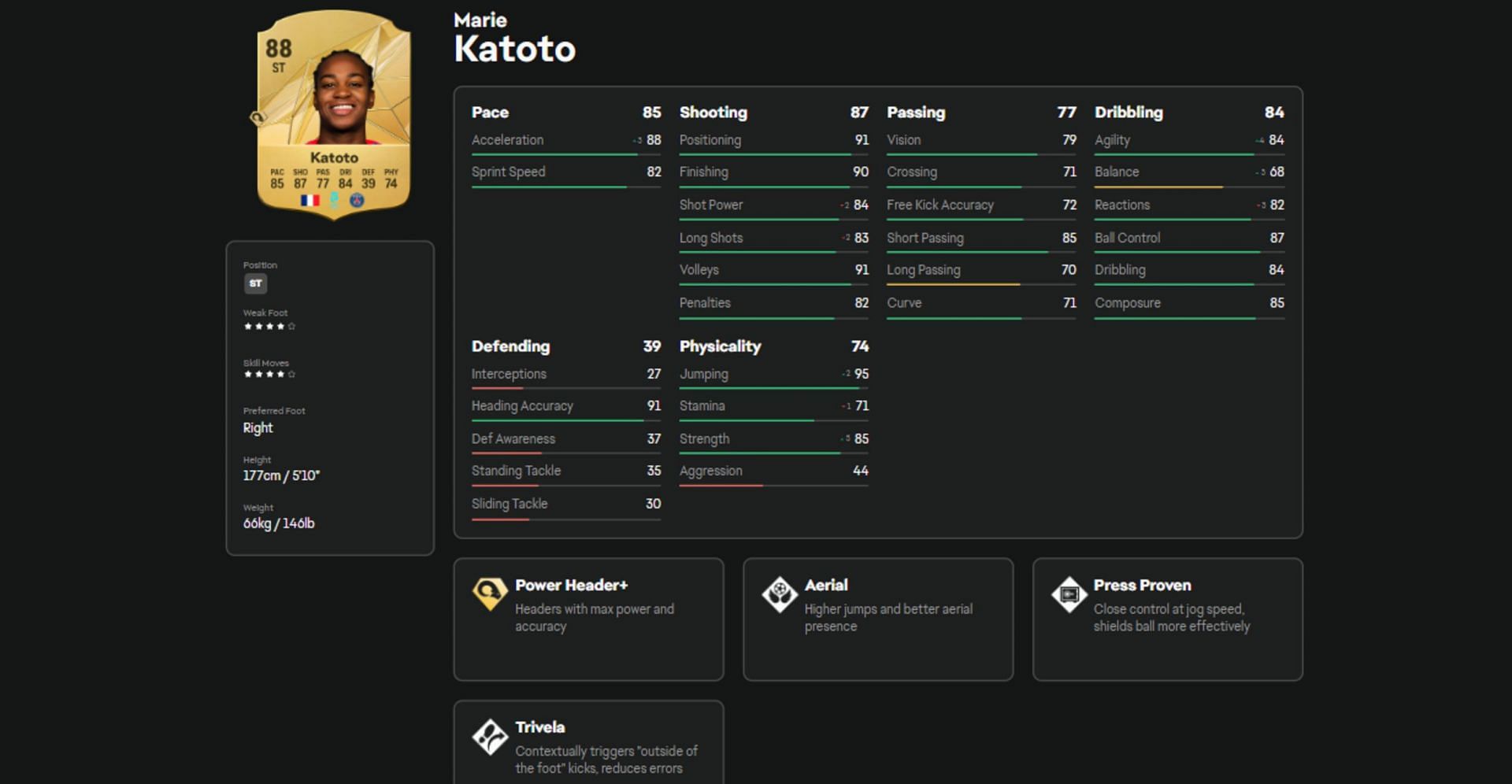 Katoto’s Press Proven PlayStyle in EA FC 25 gives her a strong presence in attacking positions. With 87 Ball Control, she can keep the ball close to her feet while shielding it from defenders, allowing you to retain possession and look for goal-scoring opportunities.