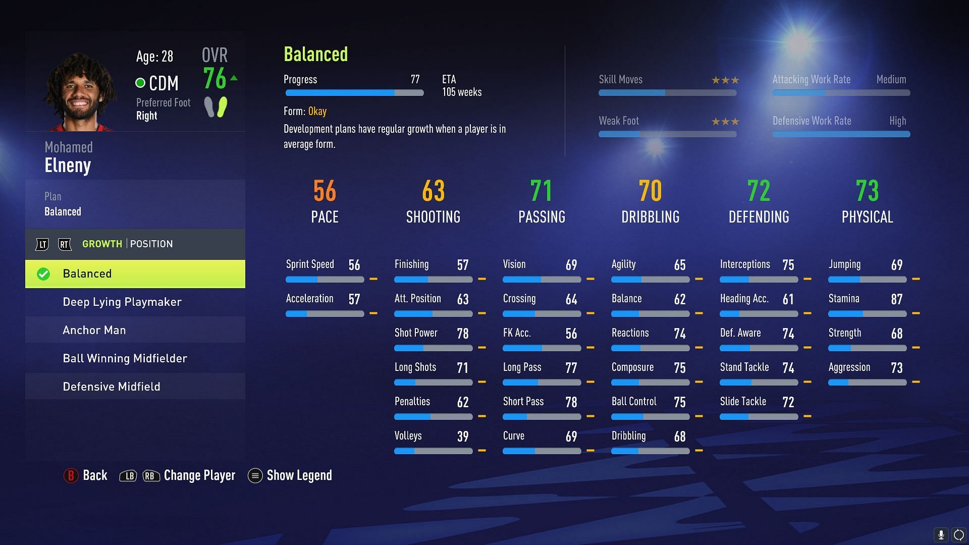Arsenal feature 3 CDMs in their roster for FIFA 22. Mohamed Elneny, the Egyptian international, is their least effective option in the position. The club has Granit Xhaka (79) and Ainsley Maitland-Niles (75) occupying defensive roles in midfield.