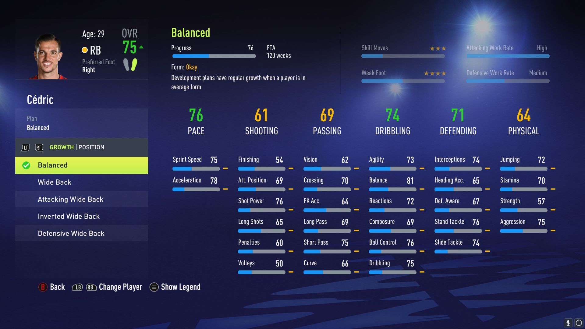 Cedric joined Arsenal on a 6-month loan in January 2020 and went on to sign with the club shortly after. The 29-year-old has a static overall rating with no potential for improvement.