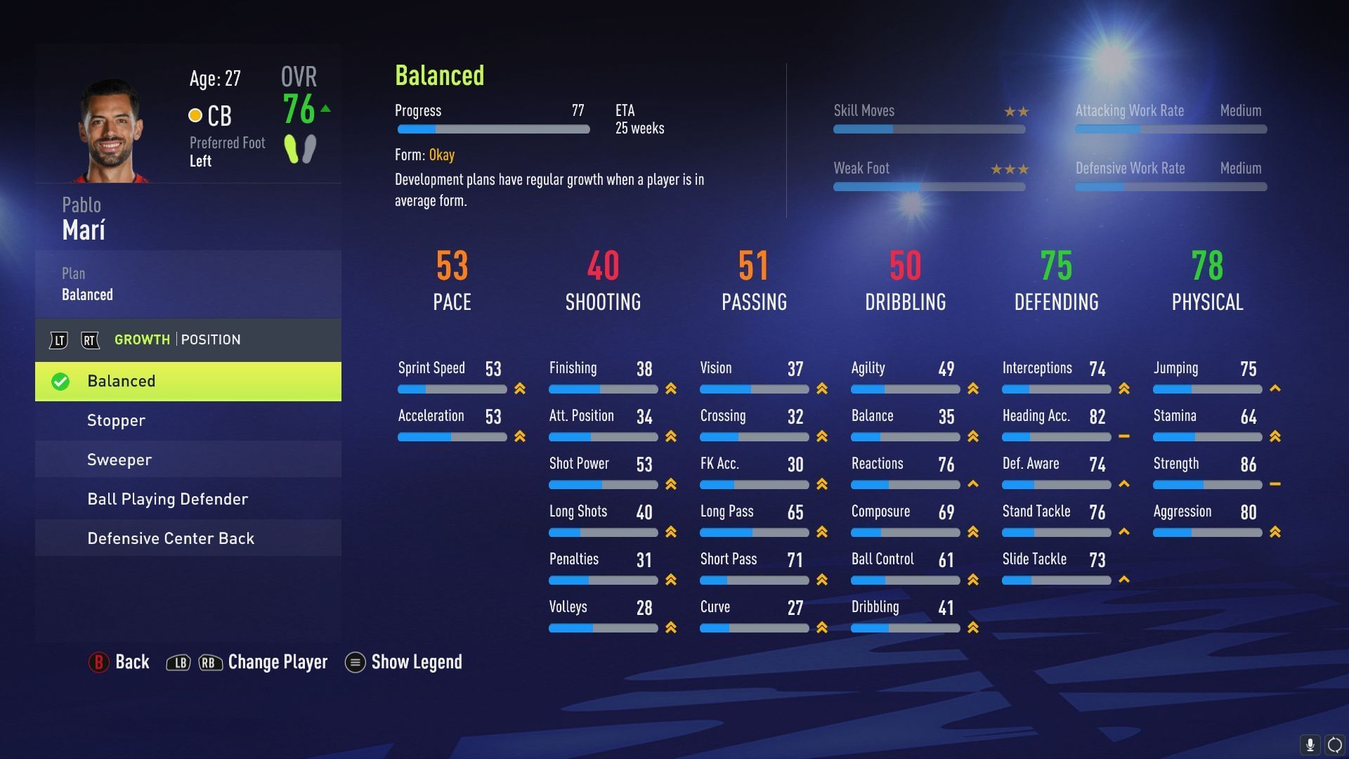 The Spanish center-half is one of five players in his position at Arsenal. While being significantly slower than his teammates, Mari also has weaker ratings in passing, dribbling, and defending than his Arsenal counterparts.